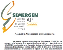 Con esta fecha, se convocan elecciones a la Junta Autonómica de SEMERGEN en Cantabria, a celebrar el 26 de octubre de 2.012 Durante la primera semana se constituirá la Junata Electoral Autonómica y durante este primer mes, se presentarán las candidaturas, adecuándose a la reglamentación electoral establecida. Durante el primer mes, se mantendrá expuesto en la Sede Social de SEMERGEN el Censo electoral, que podrá ser consultado personalmente, por correo postal o correo electrónico.